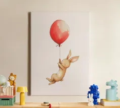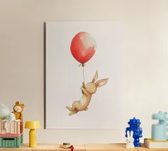 Un piccolo coniglio vola via in un palloncino rosso: un motivo magico pieno di leggerezza e fantasia. Questo poster porta calore, giocosità e un tocco di magia nella stanza di ogni bambino. Ideale per i genitori che cercano un'arte affascinante e affettuosa per i loro piccoli. È anche una splendida idea regalo.