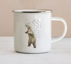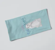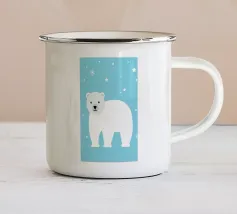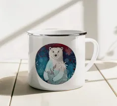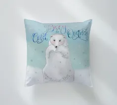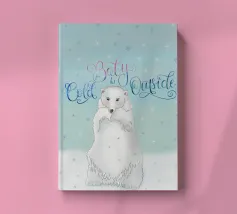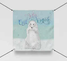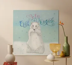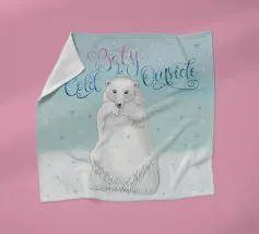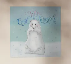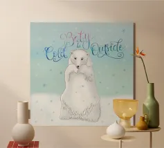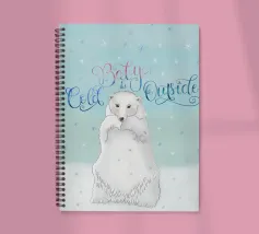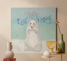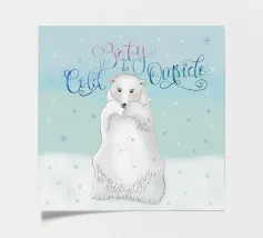 Un simpatico orso polare si trova nella neve. Cadono fitti fiocchi di neve. Accompagnato dalla scritta: Baby, it's cold outside. Bellissimo disegno a mano con ghirigori decorativi e una bella sfumatura di colore con blu e rosa. Un motivo carino, adatto soprattutto ai bambini.