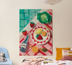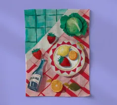 Vista dall'alto di un delizioso picnic su una coperta a scacchi rosa, con un piatto di frutti di mare, insalata e gin. La scena è una rappresentazione fresca, appetitosa ed elegante di un perfetto pasto estivo all'aperto.
