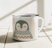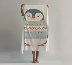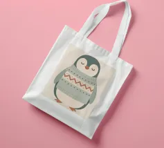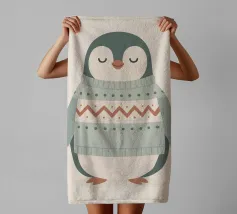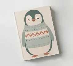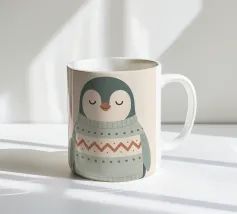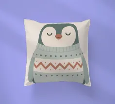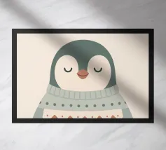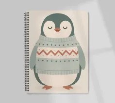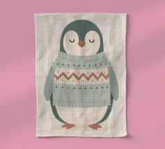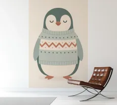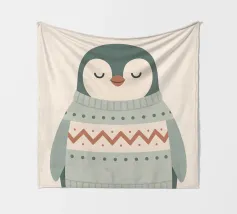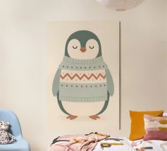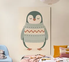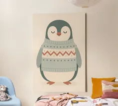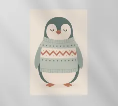 Un pacifico pinguino avvolto in un maglione invernale a fantasia. I colori tenui e le forme semplici conferiscono a questo pezzo un'estetica scandinava rilassante, adatta agli interni moderni e festivi.