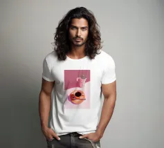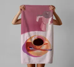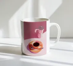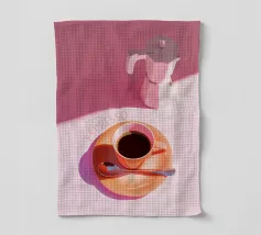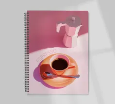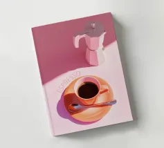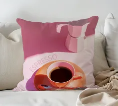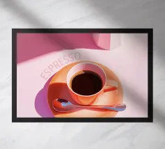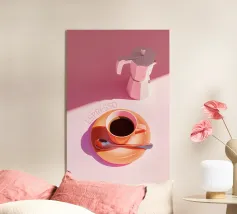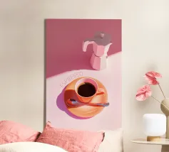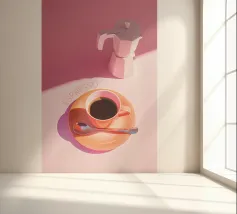 Questa elegante illustrazione con tazzina e macchina da caffè su uno sfondo rosa pastello incarna la passione per il caffè e conferisce un'estetica moderna e minimalista a qualsiasi ambiente. La scritta "Espresso" completa il design e si rivolge agli amanti del caffè.