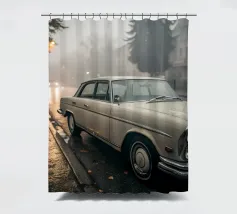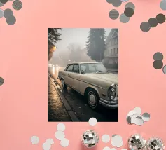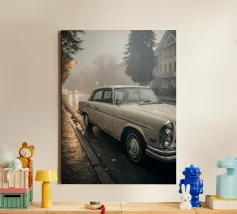 Un ritratto dettagliato di un'auto d'epoca bagnata dalla pioggia, che trasmette un senso di nostalgia ed eleganza. Fotografia di alta qualità, perfetta per gli appassionati di automobili, gli amanti dell'arte e i graphic designer. Le texture, i colori e i dettagli nitidi catturano l'attenzione.