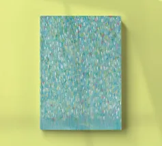 Questa immagine raffigura un dipinto astratto caratterizzato da una moltitudine di brevi pennellate verticali in una varietà di colori su un morbido sfondo blu. Le pennellate creano una superficie strutturata e ritmica che dà l'impressione di un movimento delicato o forse di una pioggia che cade. C'è un senso di profondità creato dalla stratificazione della pittura, con accenni di toni più caldi che fanno capolino tra quelli più freddi. L'effetto complessivo è rilassante e ricorda gli elementi della natura, evocando sensazioni simili a quelle che si provano osservando i riflessi della luce sull'acqua o le foglie che frusciano nella brezza.