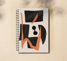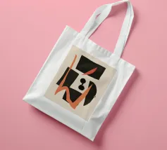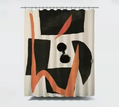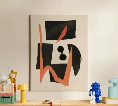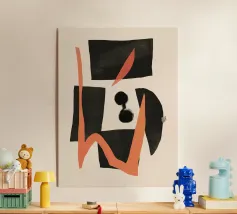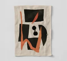 Un insieme di forme astratte in nero e arancione sono disposte su uno sfondo beige. La composizione non è rappresentativa e si concentra sul contrasto e sull'equilibrio tra le forme angolari e quelle arrotondate.