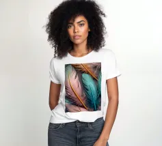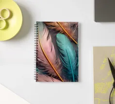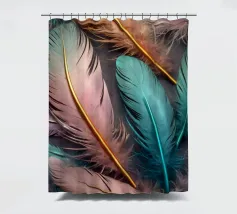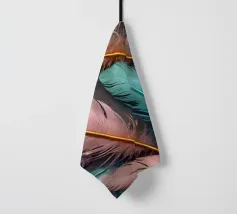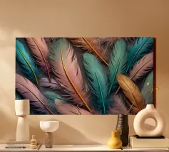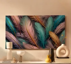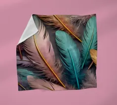 Una collezione di piume vibranti nei toni del rosa, del blu e dell'oro è disposta artisticamente su uno sfondo scuro, mettendo in risalto le loro texture e i loro colori unici.