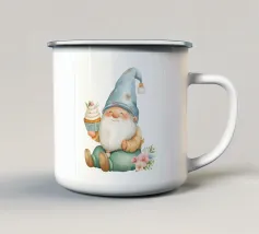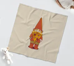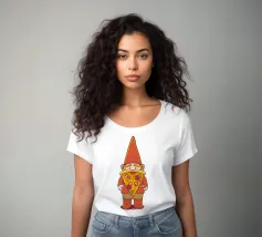 Un piccolo gnomo vestito di arancione, al posto della barba una fetta di pizza con formaggio e pomodori. Un'arte perfetta per chi ama la pizza e gli gnomi.