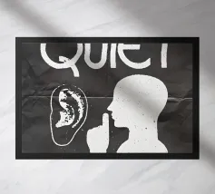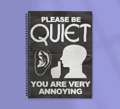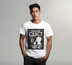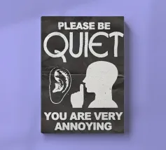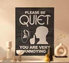 "Un annuncio di servizio pubblico ironico e crudo con il testo 'PLEASE BE QUIET. Sei molto fastidioso' sopra e sotto le illustrazioni minimaliste di un orecchio e di una silhouette con un dito sulle labbra, il tutto in bianco consumato su uno sfondo nero, che trasmette un messaggio di esasperazione e un appello al silenzio",