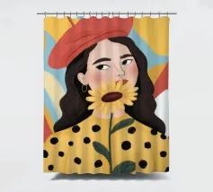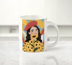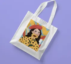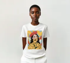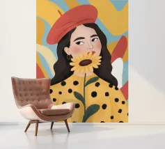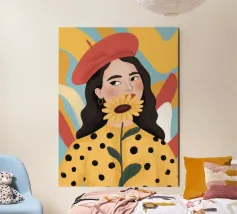 Questo dipinto mostra una persona che indossa una camicia gialla a pois neri e un berretto rosso. Lo sfondo è un motivo astratto colorato con sfumature di blu, giallo e arancione, che conferisce all'opera un'atmosfera giocosa e vivace.