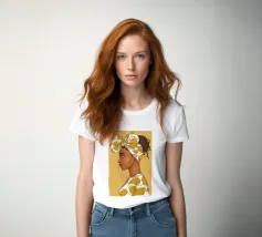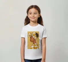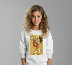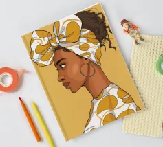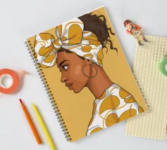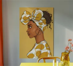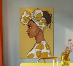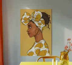 Un bellissimo ritratto di una donna di colore che indossa un elegante foulard con un motivo a limone. La sua espressione elegante e composta e il giallo vibrante creano un'immagine chic, sicura e sorprendente.