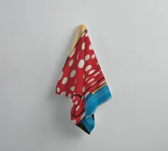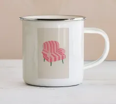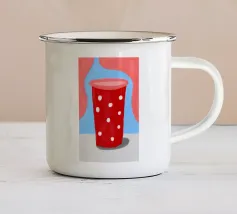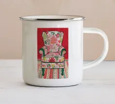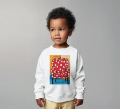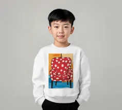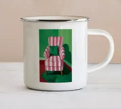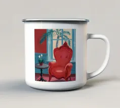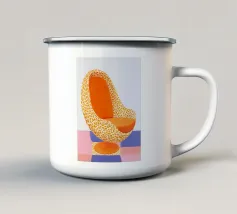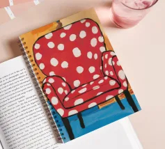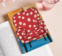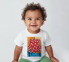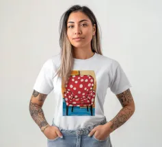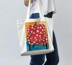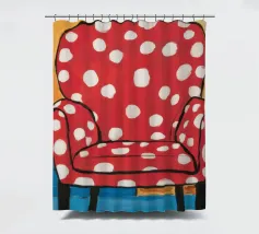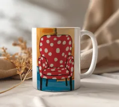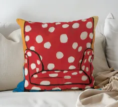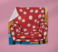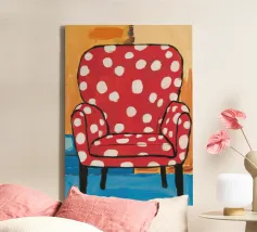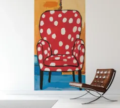 Un'audace illustrazione di una poltrona classica rivestita in un vivace tessuto rosso con grandi pois bianchi, che la rendono un pezzo divertente e giocoso.