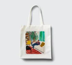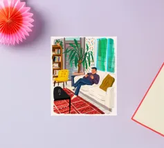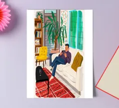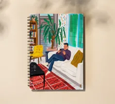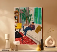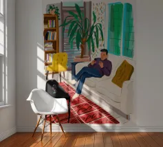 Un uomo si rilassa su un divano bianco, leggendo un libro in un soggiorno luminoso e soleggiato. Grandi piante e un tappeto colorato creano un'atmosfera confortevole e moderna.