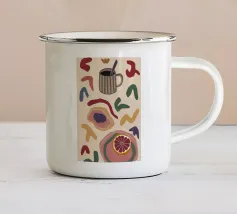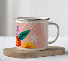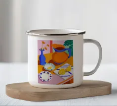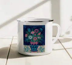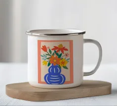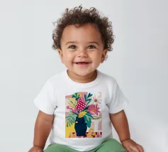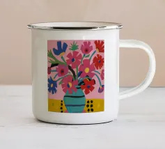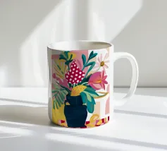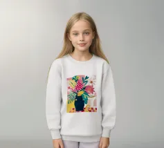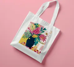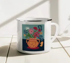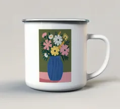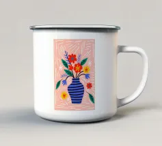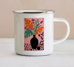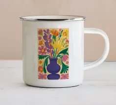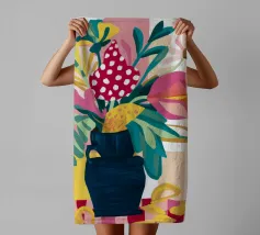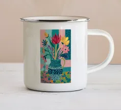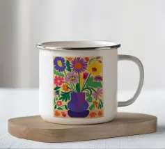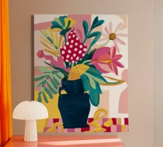 Un'audace natura morta di fiori con motivi a pois in un vaso dalla forma unica, su uno sfondo giallo brillante, che crea un'atmosfera giocosa e pop art.