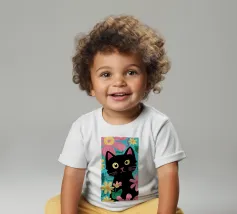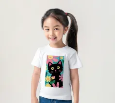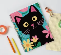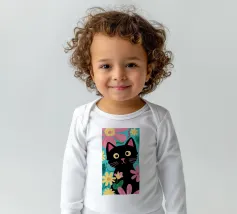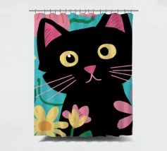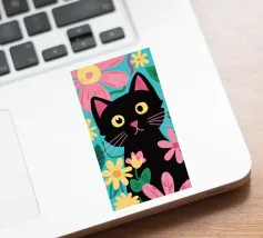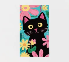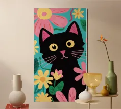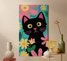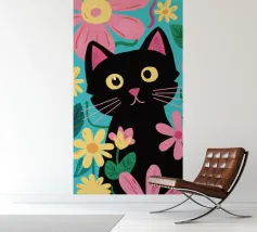 Un gatto nero stilizzato circondato da fiori vivaci e colorati su uno sfondo rosa. La composizione è una divertente, moderna e allegra celebrazione pop art dei gatti e della natura.