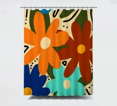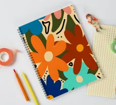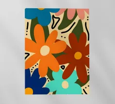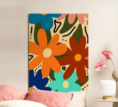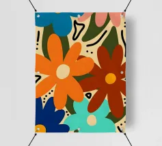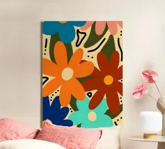 Un allegro design floreale retrò con grandi fiori colorati in arancione, blu, marrone, rosa e turchese. Lo stile giocoso ricorda il flower power degli anni '70 e porta vivaci vibrazioni boho in ogni casa. Perfetto come poster floreale colorato per soggiorni, camere dei bambini o spazi di lavoro creativi. Molto apprezzato dagli appassionati di arte floreale audace, decorazioni di ispirazione vintage, illustrazione botanica, arte floreale moderna, stampa floreale pop art, decorazioni domestiche bohémien, opere d'arte in stile margherita, interni scandi bohémien, arte murale felice, forme floreali astratte, poster ispirato alla natura, design domestico allegro, arte per l'amore floreale