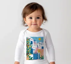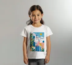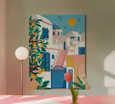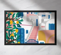 Una vista classica e pittoresca di un edificio bianco con una porta e una cupola blu brillante in una città dell'isola greca, probabilmente Santorini. La composizione cattura perfettamente il fascino iconico e solare delle Cicladi.