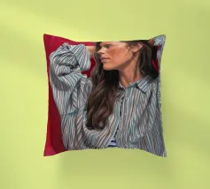 Una donna sicura di sé a righe posa su un audace sfondo rosso, trasudando stile moderno e intensità.