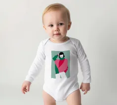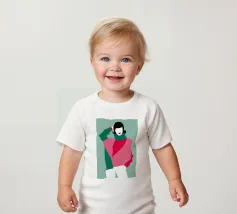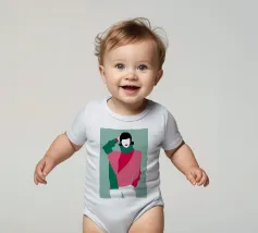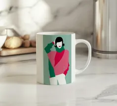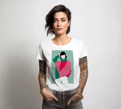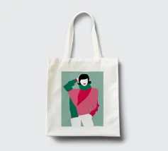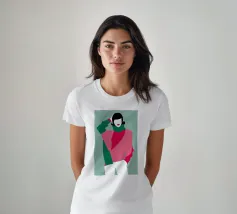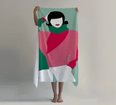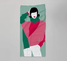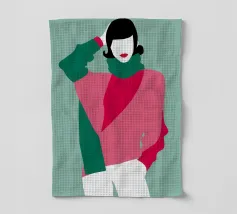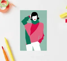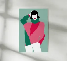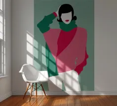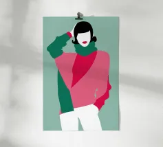 Ritratto di una donna in un elegante abito retrò rosa e rosso con foulard verde, in posa sicura. Lo stile grafico a blocchi di colore è molto chic.