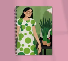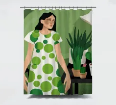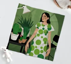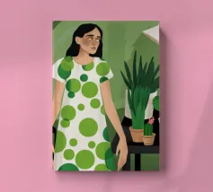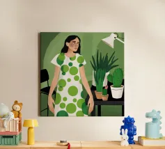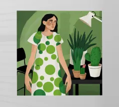 Un'allegra illustrazione di una donna con gli occhiali, che indossa un abito bianco a grandi pois verdi. È circondata da una varietà di piante d'appartamento, tra cui un cactus, a dimostrazione dell'amore per il giardinaggio indoor e di uno stile di vita da "genitore di piante".