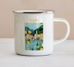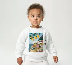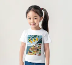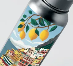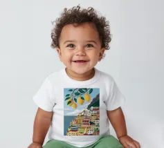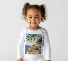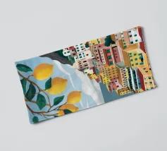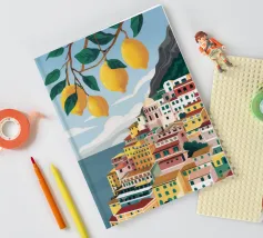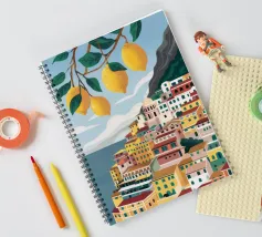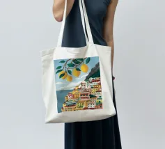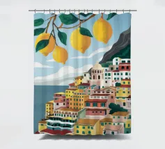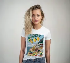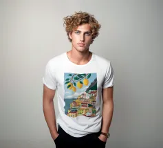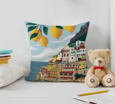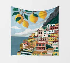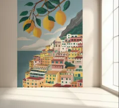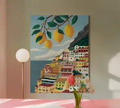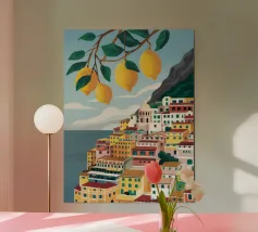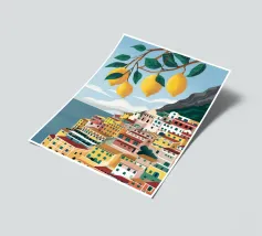 Una splendida e pittoresca illustrazione delle colorate case sulla scogliera di Positano, sulla Costiera Amalfitana, incorniciate da un ramo di un albero di limoni. La scena cattura perfettamente la bellezza solare, vibrante e iconica dell'Italia costiera.