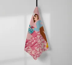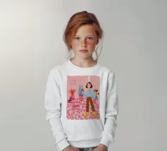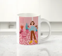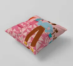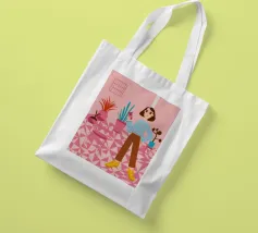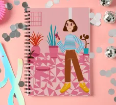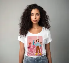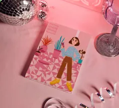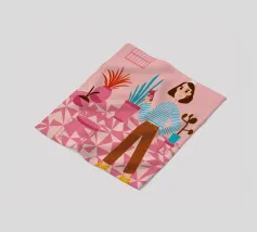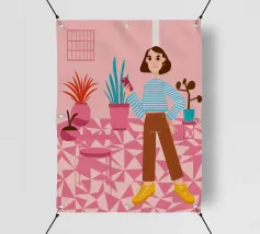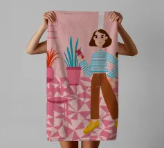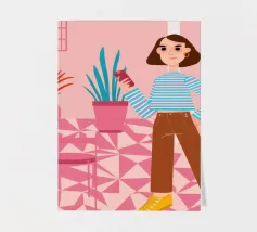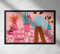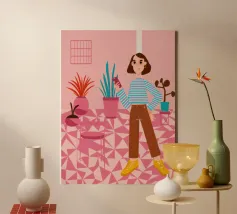 Una persona con una camicia a righe e stivali gialli sta in piedi con sicurezza in una stanza con un sorprendente pavimento a motivi geometrici rosa, circondata da piante d'appartamento, emanando un'atmosfera allegra ed elegante.