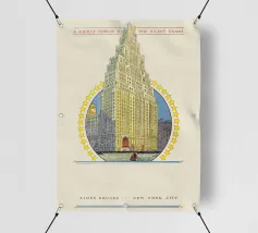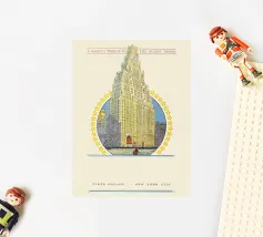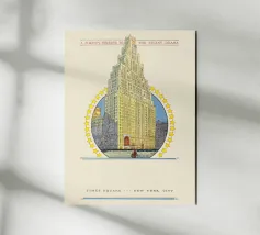 Tornate all'epoca d'oro del cinema con questo affascinante poster d'epoca che celebra il Paramount Building a Times Square, New York. L'illustrazione dettagliata raffigura l'iconico grattacielo Art Déco, coronato da una torre dell'orologio e da un arco stilizzato, circondato da un anello di stelle. Il testo "A Mighty Tribute to the Silent Drama" (Un potente tributo al dramma muto) colloca questo pezzo nel contesto storico dei primi film. Questo poster digitale di alta qualità (7000x5000 pixel, 300 dpi) conserva magnificamente il fascino storico e l'eccellenza artistica dell'originale. È un pezzo perfetto per gli amanti della storia del cinema, di New York C