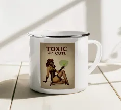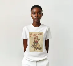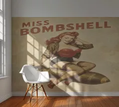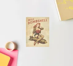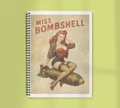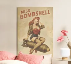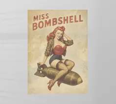 Una pin-up d'epoca dai capelli rossi e dal sorriso giocoso è seduta su una grande bomba, evocando un'estetica bellica. È vestita con un top rosso, pantaloncini blu a vita alta e calze, con il testo "Miss Bombshell" ben visibile sopra.