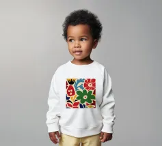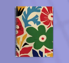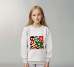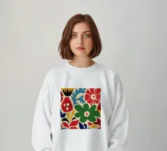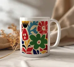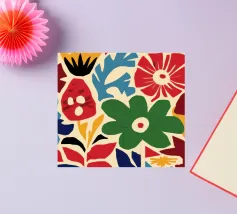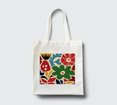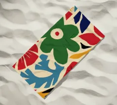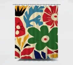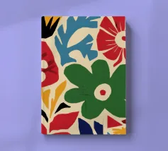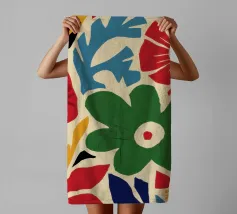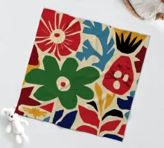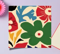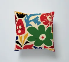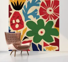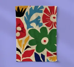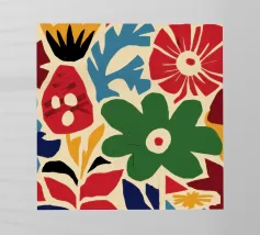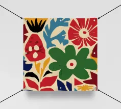Un audace motivo ripetuto di grandi fiori stilizzati nei colori verde, rosso e giallo conferisce un'atmosfera allegra e retrò che ricorda il design degli anni '60 e '70.