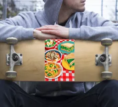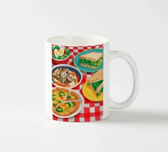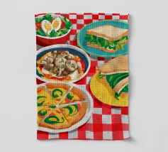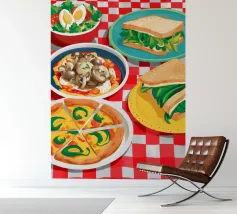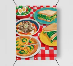 Una vista dall'alto di un delizioso pranzo, che comprende un panino e una fetta di crostata salata, serviti in piatti su una classica tovaglia a scacchi rossi e bianchi.