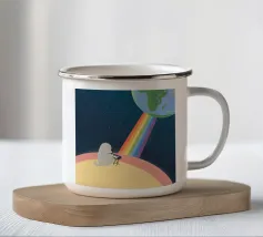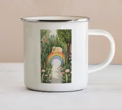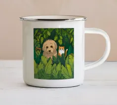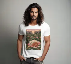 Questa opera d'arte ritrae due cani, uno bianco e uno marrone, che riposano insieme su una coperta in mezzo a un campo di fiori. Il sole al tramonto proietta una calda luce su questa scena tranquilla e affettuosa.
