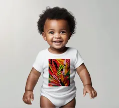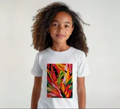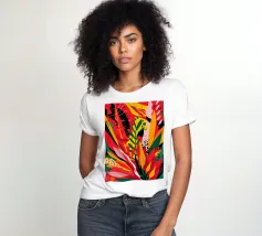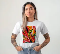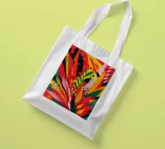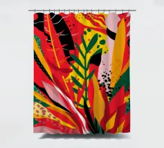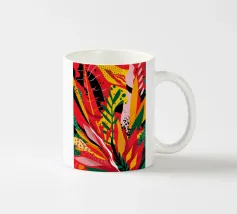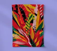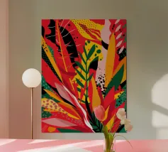 Un'ardente ed energica composizione astratta di foglie e forme tropicali in una tavolozza primordiale di rosso, arancione e giallo, con audaci linee nere.