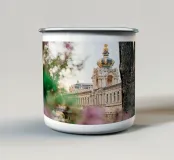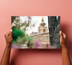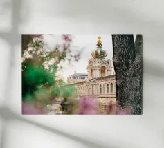 Fotografia dello Zwinger di Dresda in primavera. Fotografata attraverso i rami in fiore, l'immagine mostra l'architettura barocca con una luce morbida e colori caldi. Un motivo armonioso tra storia e natura.