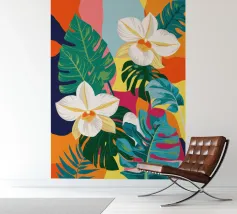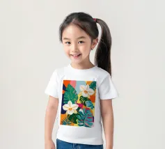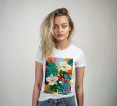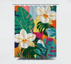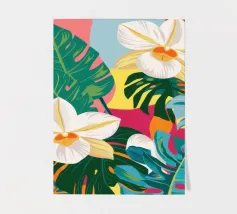 Una lussureggiante illustrazione botanica di bellissimi fiori bianchi di plumeria (frangipani) che sbocciano tra vibranti foglie tropicali multicolori.