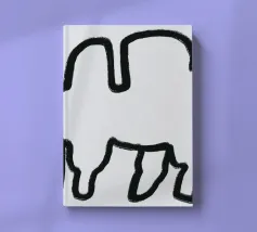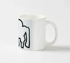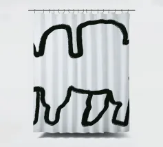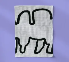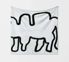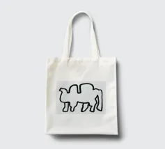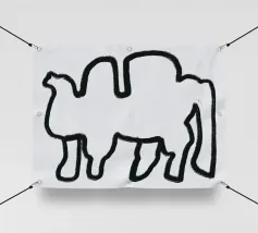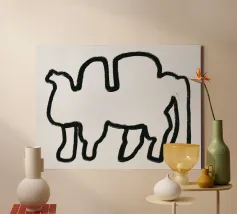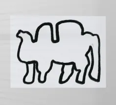 Il profilo nero minimalista di un cammello con due gobbe si staglia su uno sfondo grigio chiaro, catturando l'essenza dell'animale con audace semplicità. L'uso di linee spesse e continue conferisce al disegno una qualità moderna e astratta.