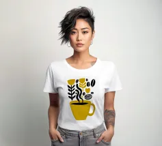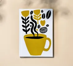 Questa composizione giocosa abbina il caffè alle sue origini botaniche. La ridotta combinazione di colori bicolore, giallo senape caldo e nero intenso, ricorda le illustrazioni scandinave della metà del secolo scorso. Piante di caffè stilizzate, chicchi danzanti e forme di foglie decorative spuntano allegramente dalla tazza dorata: una visualizzazione poetica della filosofia farm-to-cup. L'estetica serigrafica bidimensionale e il linguaggio ingenuo del design conferiscono all'opera un fascino artigianale. Perfetta per la cucina, per le pareti dei bar e per tutti coloro che non vogliono solo bere il caffè, ma vogliono celebrarne l'intera storia.