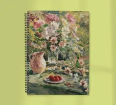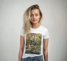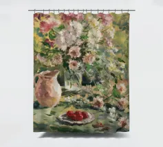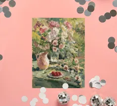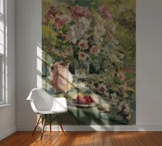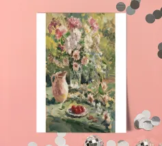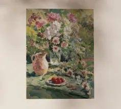Un vibrante dipinto impressionistico di una scena di giardino lussureggiante, con una profusione di fiori colorati, forse rose o peonie, in un vaso o che crescono in abbondanza, con accenni a una tavola imbandita. La pennellata sciolta e la tavolozza luminosa trasmettono la gioiosa esuberanza di un giardino in fiore.