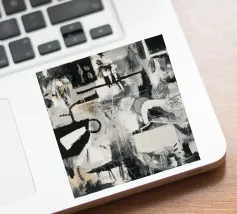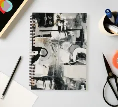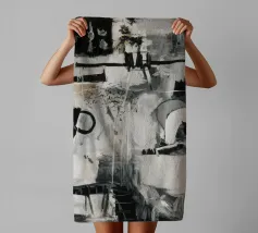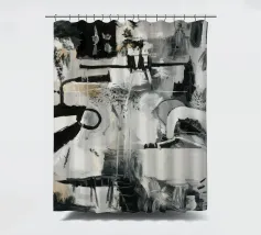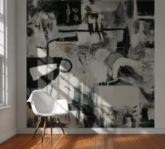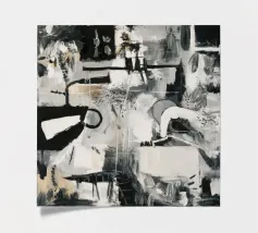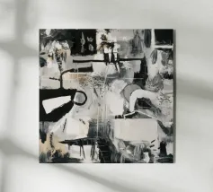 Un'opera d'arte astratta dinamica in bianco e nero con forme geometriche e organiche complesse e sovrapposte, linee e texture, che suggeriscono una planimetria decostruita di una città o uno schema industriale energico. Stile Bob Nugent.