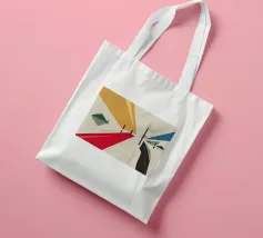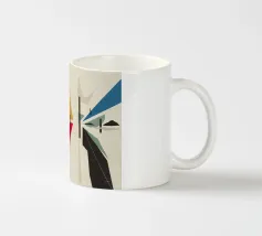 Forme geometriche audaci e linee vibranti convergono verso un punto centrale, creando un suggestivo senso di profondità e movimento. Diverse tonalità di rosso, giallo, blu e verde interagiscono con forme astratte che ricordano montagne e pali.