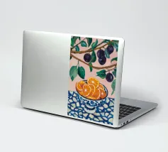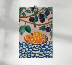 Una natura morta con una ciotola di arance e un ramo di prugne scure, su uno sfondo blu e nero. Il contrasto cromatico è ricco e accattivante.