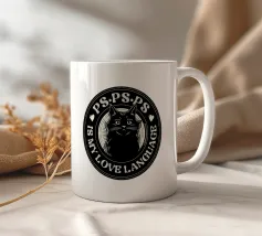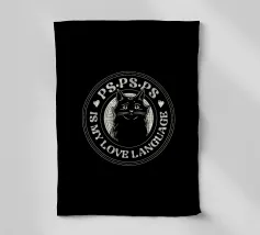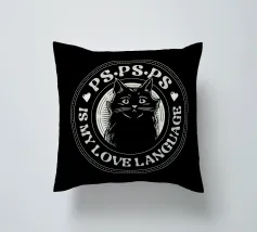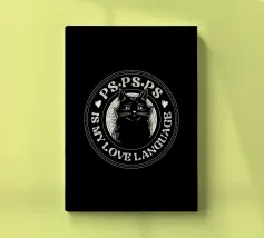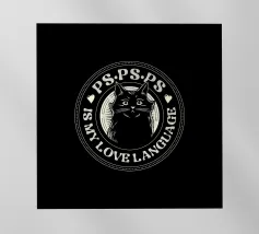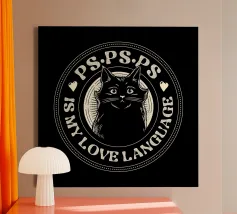 Un francobollo minimalista con un gatto nero e la frase "PSPSPS è il mio linguaggio d'amore". Questa giocosa opera d'arte cattura il suono affettuoso che emettiamo per chiamare i nostri gatti, evidenziandolo come un segno d'amore.