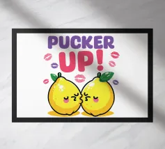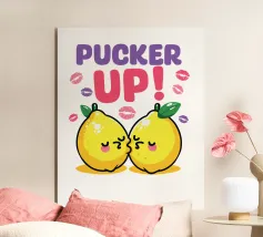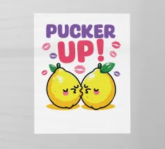 Due adorabili limoni con simpatiche espressioni facciali si baciano, circondati da segni colorati di rossetto. Sopra di loro, la frase "PUCKER UP!" è riportata a caratteri cubitali e giocosi.