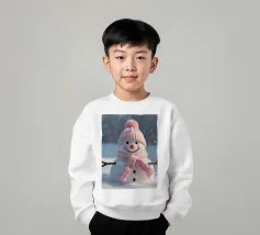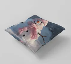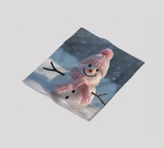 Un allegro pupazzo di neve con cappello e sciarpa rosa sorride tra i fiocchi di neve che cadono in un tranquillo paesaggio invernale. Gli alberi circostanti aggiungono fascino alla stagione.