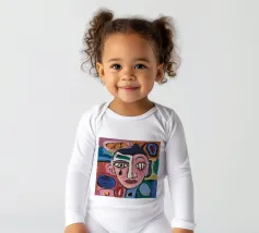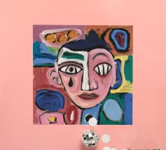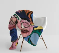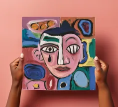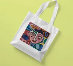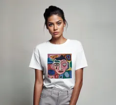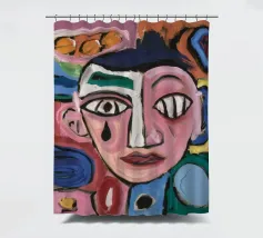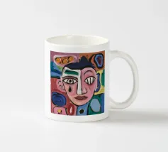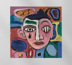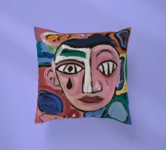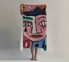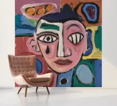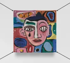 Questa opera d'arte presenta un volto dai molteplici colori e forme astratte. Lo sfondo è un mix di blu e giallo che crea un effetto vibrante e intrigante.