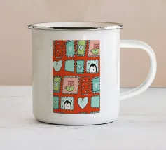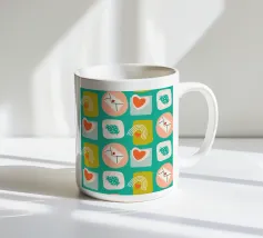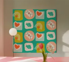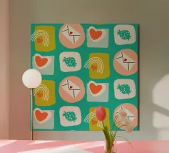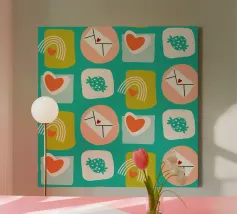 Date un tocco di fascino retrò ai vostri progetti con questo vivace disegno che presenta cuori giocosi, lettere d'amore, arcobaleni e fragole incorniciati da quadrati e cerchi astratti. Su un audace sfondo arancione, questo disegno ispirato alla metà del secolo scorso irradia energia e gioia.