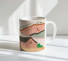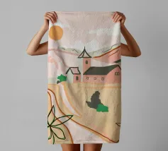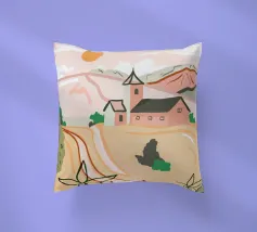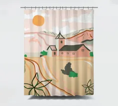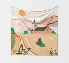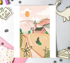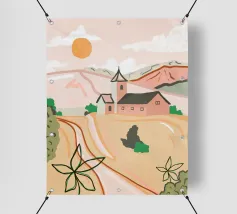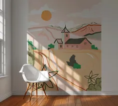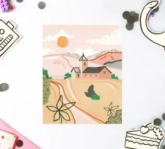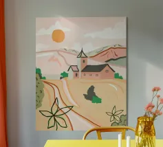 Una tranquilla scena di campagna con campi dorati, una chiesa caratteristica e un caldo tramonto. Le morbide tonalità pastello creano un'atmosfera sognante e rilassante. Perfetto per portare un senso di serenità e nostalgia in qualsiasi spazio.