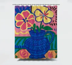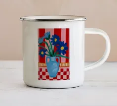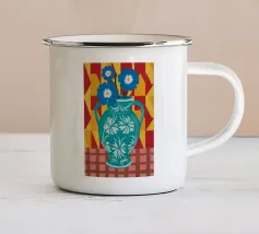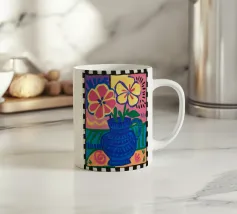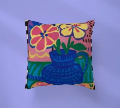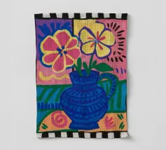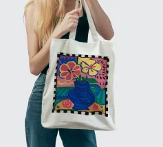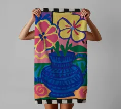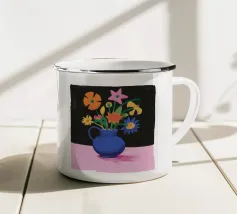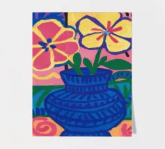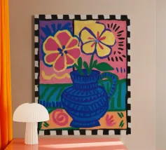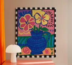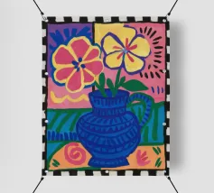 Una vivace natura morta con un vaso blu dai motivi decorativi che contiene fiori vivaci e colorati. La composizione è incorniciata da un sorprendente bordo a scacchiera in bianco e nero, che conferisce un'atmosfera giocosa ed eclettica che ricorda il fauvismo.