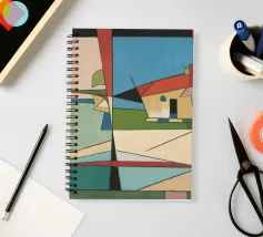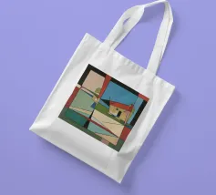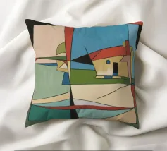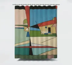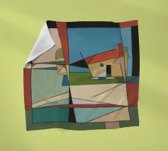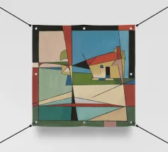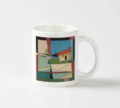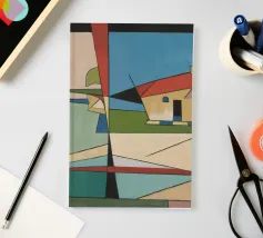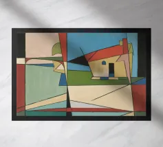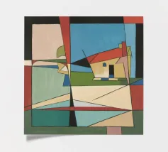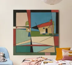 Una tranquilla casa rurale si trova al centro di piani intersecati e blocchi di colore audaci, evocando sia l'isolamento che la calma strutturata.