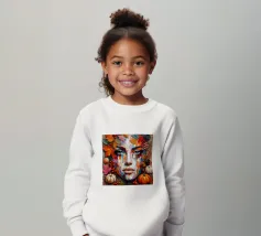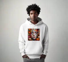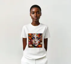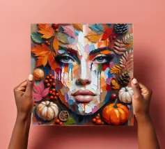 Ritratto in acrilico in cui il volto di una donna emerge da uno sfondo di foglie autunnali, frutti ed elementi naturali. Una ricca tavolozza di colori caldi, arancioni, rossi intensi, gialli dorati e marroni terrosi, che evocano immediatamente l'essenza dell'autunno. Il volto stesso è costruito con macchie di colore strutturate, quasi a mosaico, che fondono stili astratti e realistici.