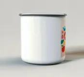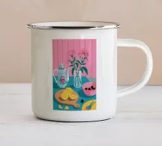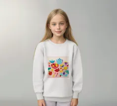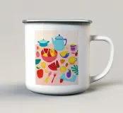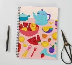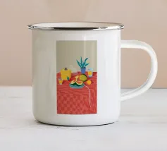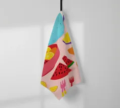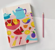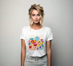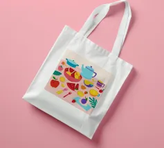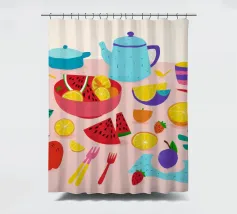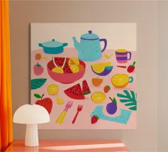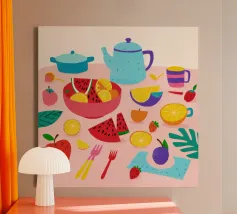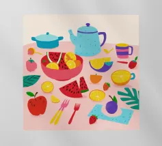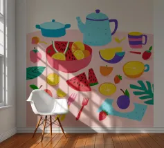 Un abbondante raccolto di frutta stilizzata, tra cui mele, angurie e limoni, è splendidamente disposto con una teiera blu, creando una ricca e colorata celebrazione della dolcezza della natura.