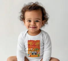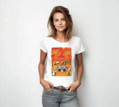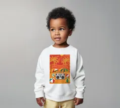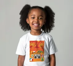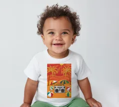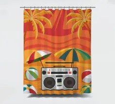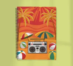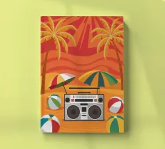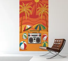 Vista dall'alto di una coperta da spiaggia con una radio vintage, un pallone da spiaggia e occhiali da sole. La scena è divertente, nostalgica e perfetta per rappresentare una classica e spensierata giornata in spiaggia.