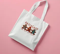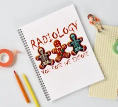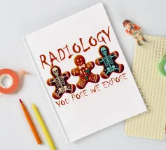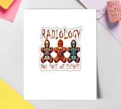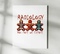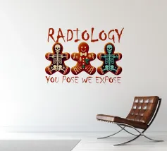 Tre figure di pan di zenzero sono raffigurate con disegni di scheletri a sinistra e a destra e un aspetto normale al centro. Sopra di loro è riportata la scritta "RADIOLOGY" e sotto, la frase "YOU POSE WE EXPOSE" aggiunge un tocco umoristico.
